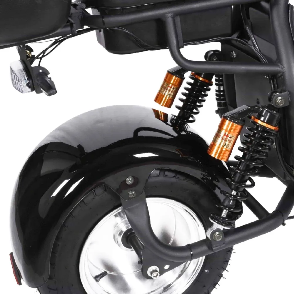 Электроскутер  Citycoco Kugoo C6 – обновленный вариант бренда занимает лидирующие позиции в продажах. Брутальный кричащий дизайн заинтересовал райдеров-экстремалов и любителей рыбалки. Широкая отлично сцепляемые шины обещают отличную проходимость и отсутствие проблем в дороге. Техника создана для езды по бездорожью, не разочарует при преодолении небольших препятствий и путешествии по лесным тропинкам.