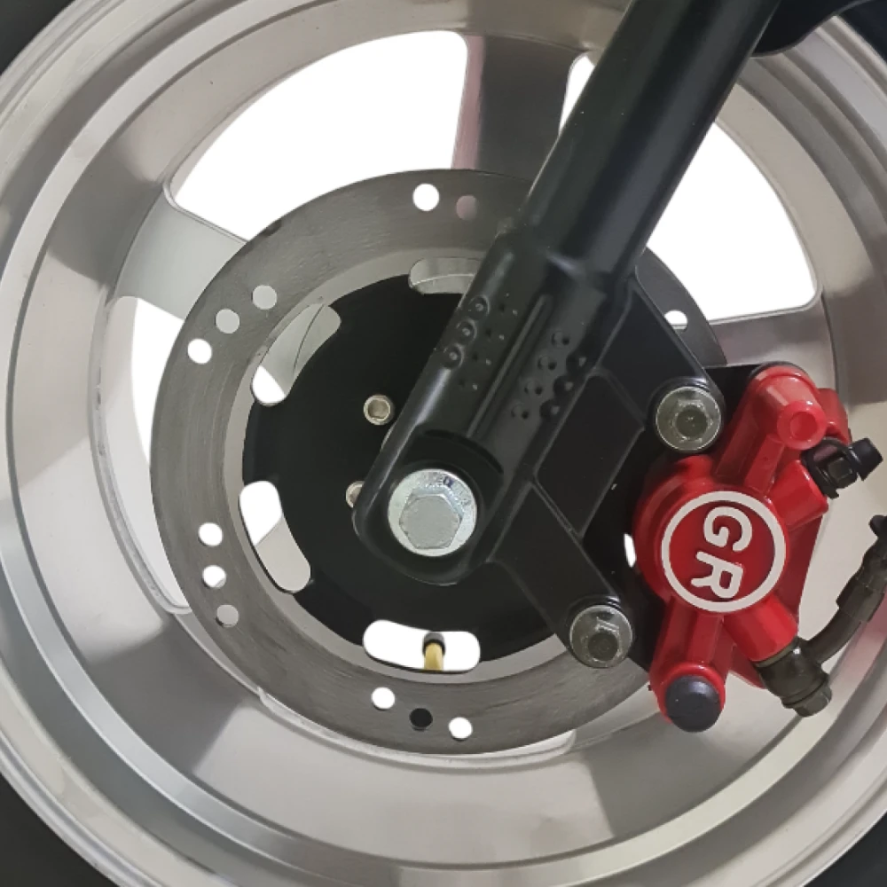 Гидравлические тормоза на обоих осях обеспечивают мгновенную остановку даже на высокой скорости. Прочная стальная рама выдерживает нагрузку до 250 кг, делая скутер универсальным для поездок вдвоем или перевозки груза.