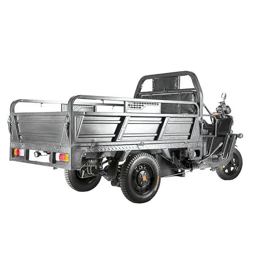 Темно-серый грузовой электротрицикл Rutrike D4 1800 60V1500W практичная многофункциональная техника, обеспеченная необходимыми для комфортного использования аксессуарами и деталями. Имеет зеркала заднего вида, качественную тормозную систему, мощную светодиодную фару, компактное сиденье, повторяющее анатомические части тела и снижающие нагрузку с позвоночника.