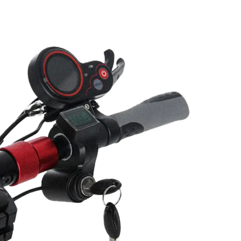 Бортовой компьютер представлен в пластиковом корпусе ,на нём располагает курок для набора скорости. Он имеет аккуратный небольшой дисплей круглой формы. Сам дисплей цветной, для управления предусмотрены 2 кнопки, а именно кнопка включения и Mode. Они требуются для навигации в меню, выбора нужных параметров, сохранения настроек и смены скорости.